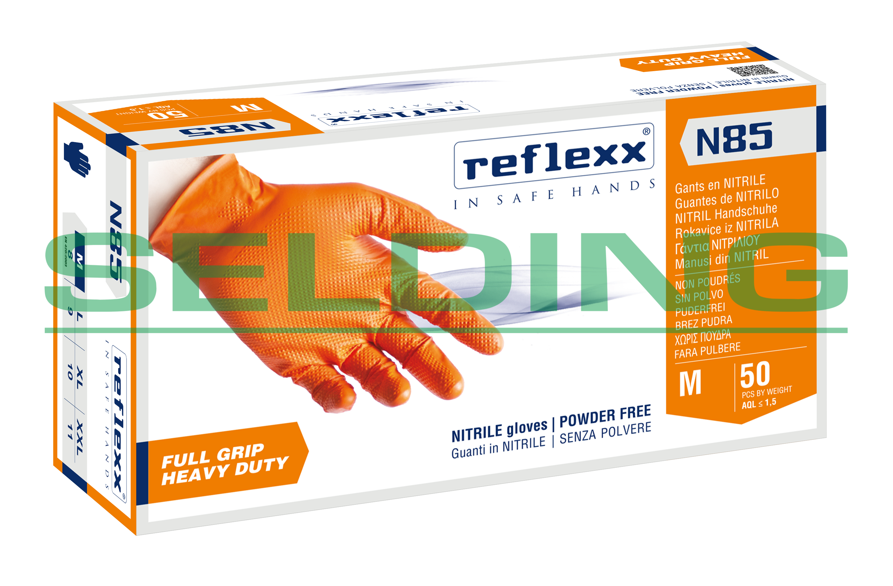Cimdi nitrila nepūderēti īpaši izturīgi, 3D REFLEXX Orange Full Grip N85, 8-M, oranži, 50gab (10)