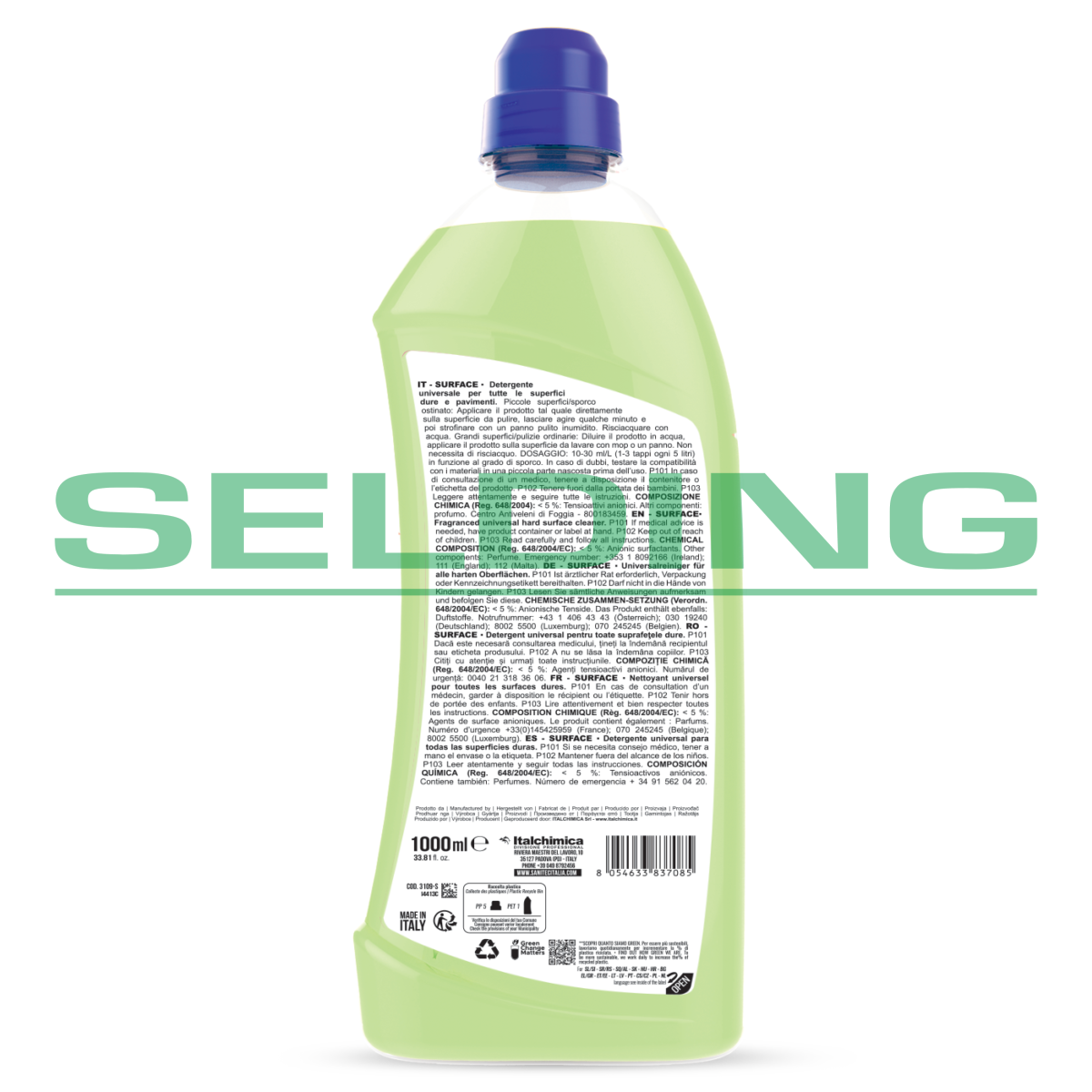 Iepakojums: 1L, pH 10,5. Koncentrēts. Visu ūdens izturīgu virsmu un grīdu tīrīšanai. Nav nepieciešams noskalot. Produkta sastāva pamatā ir dabiskas izcelsmes virsmaktīvās vielas, kas nodrošina augstu rezultātu. Lietojot ekonomiski ļauj līdz minimumam samazināt ietekmi uz vidi. Lietošana: 2 vāciņi/ 5L ūdens. Nav nepieciešama skalošana. Produkts piemērots grīdas mazgājamai mašīnai bez pretputu piedevas.