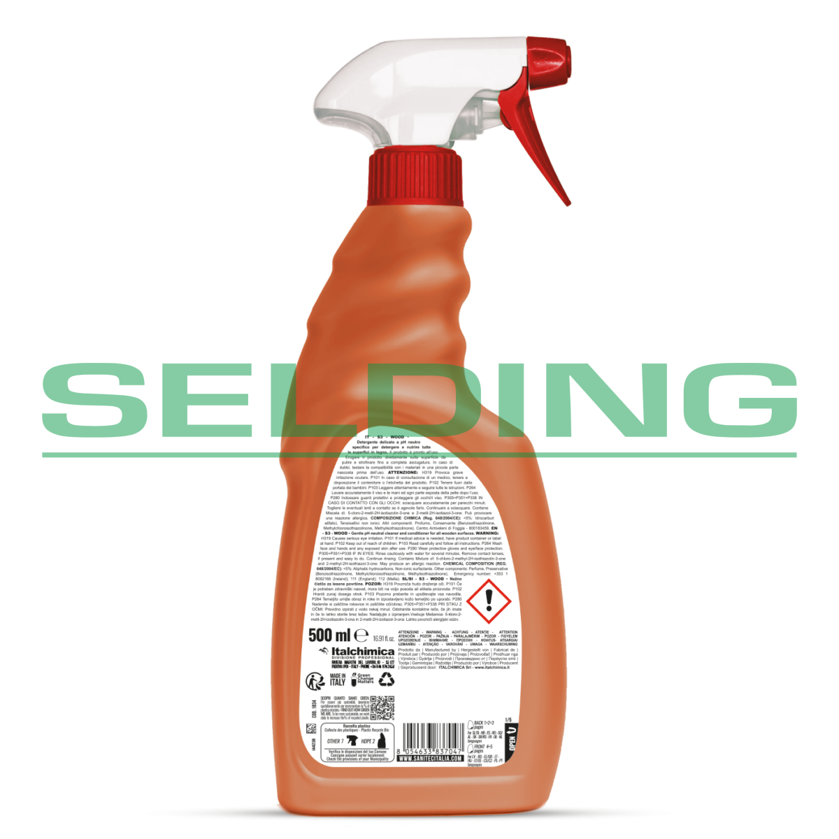 Iepakojums: 500ml, pH 7. Gatavs lietošanai. Saudzīgs, neitrāls mazgāšanas līdzeklis, kas satur dabīgas sastāvdaļas un karnaubas vasku, kas ir īpaši paredzēts koka virsmu tīrīšanai. Noņem netīrumus un noturīgus traipus. Lietošana: Izsmidziniet līdzekli uz tīras drānas no apmēram 20cm attāluma. Noslaukiet apstrādājamo virsmu ar drānu, līdz tā ir pilnīgi sausa. Atbilst H.A.C.C.P. (apstiprināts izmantošanai PĀRTIKAS jomā).