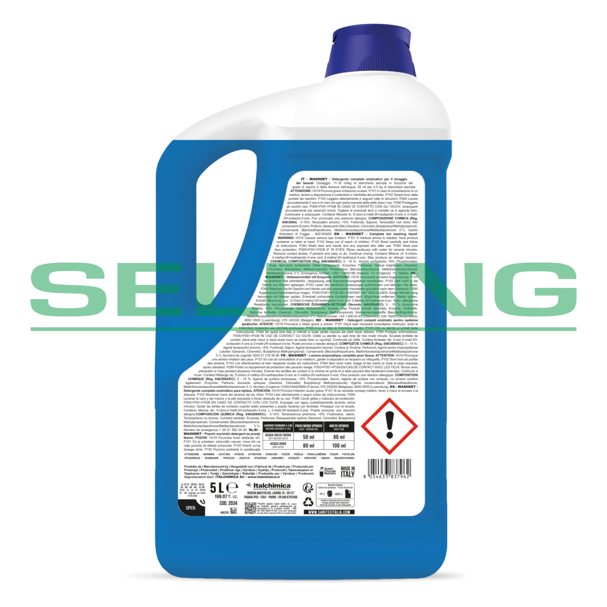 Объем: 5л. ПРЕДНАЗНАЧЕНО НА 100 СТИРОК. Жидкое моющее средство для белой и цветной ручной и машинной стирки, также эффективен при низких температурах. Содержит энзимы, которые способны удалить самые стойкие пятна при защите ткани. Придает белью приятный аромат. Подходит для всех типов белых и цветных тканей. Использование: Вылейте в соответствующий контейнер и стирайте, используя обычный цикл стирки. Ручная стирка: вылейте изделие в теплую воду и вымойте как обычно.